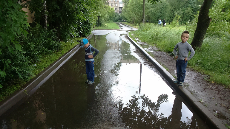 Деткам было разрешено ходить в сандалях и носках по лужам...... Масяня стоит вроде в луже, но пока боится, Андрюша вообще в шоке, что как это по лужам ходить :)