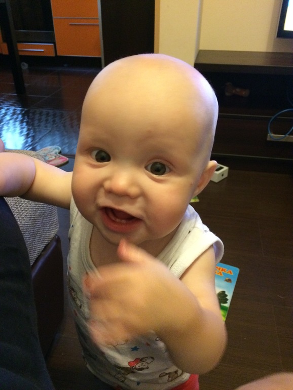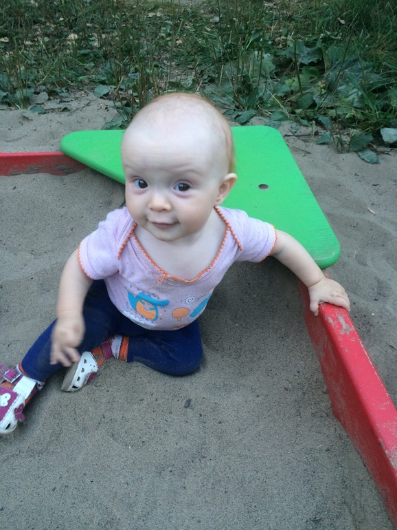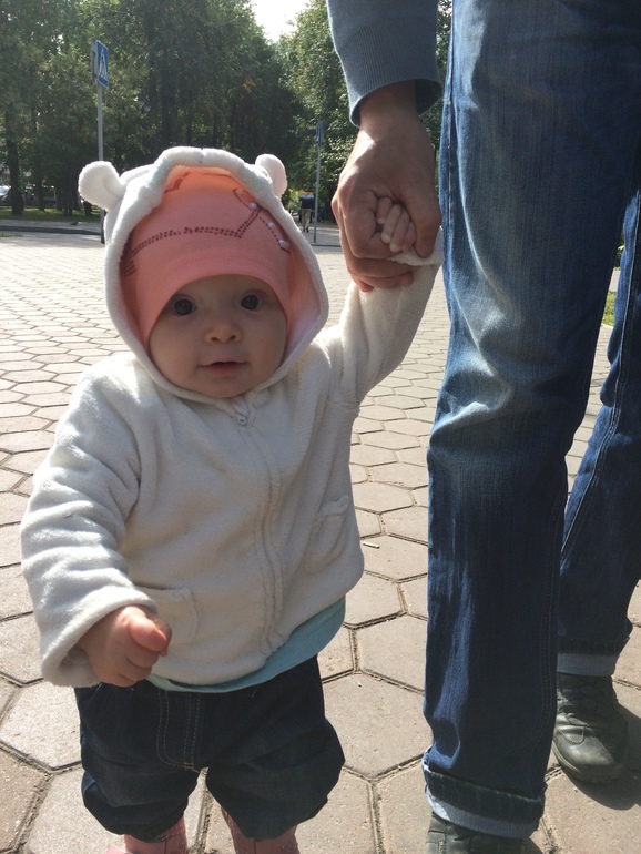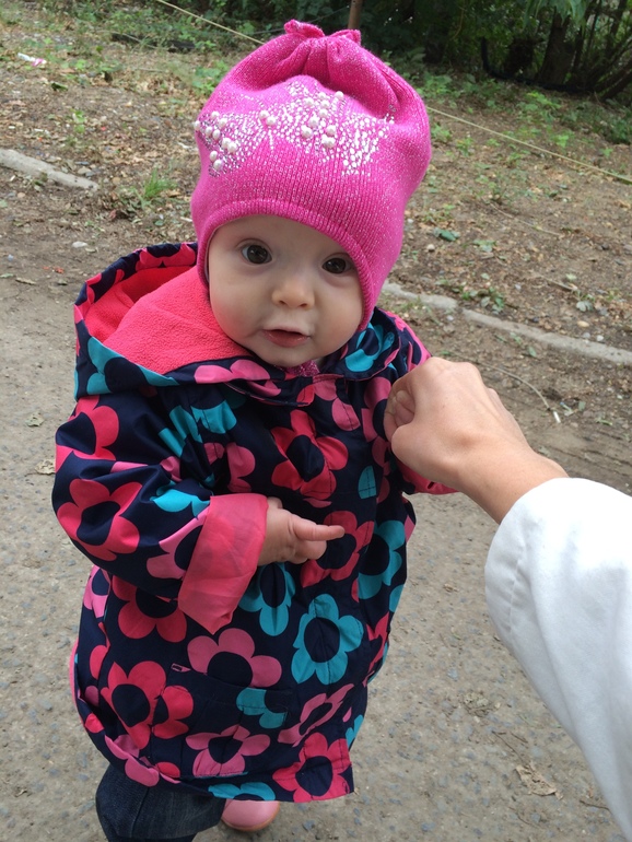 Евушка. Любительница посидеть на ручках и пообниматься:)) умеет делать пока, полетелиполетелинаголовкусели, какая большая выросла, говорит мама, папа, баба, деда, Тетя, дай, надо, Ляля, муя, авав, делает индейца. Ходит у опоры, за одну ручку похуже Яны, за две просто летает ииии начала отпускаться и стоять пару секунд сама!