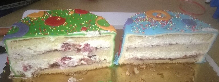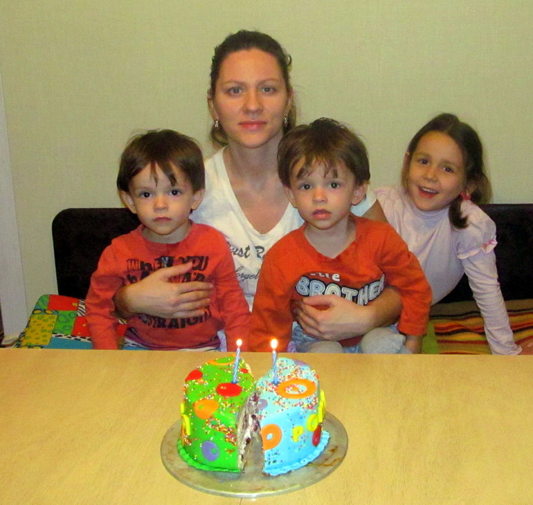 Позитив =)Как в том клипе, хочется прыгать и плясать - Кто молодец? - Я молодец! - Кто молодец? - Я молодец!)))) Как сказала наша тетушка сегодня - самое сложное позади. И она права. Я готова всю жизнь идти рядом с детьми, переживать за них, но колбаситься ночами и днями с маленькой двойней - O, No, а еще учесть что они много болели, т.к. есть старшая, ходящая в эту клоаку - сад. Ох сколько я пережила за эти 2 года, сейчас вспоминаю и думаю как мне хватило сил. Были и переезды и недельные отсутствия мужа и вообще всех и я одна с тремя и при этом еще ремонт и жизнь в однушке до 7 месяцев двойни. Короче насыщенное времечко было! И вот наконец праздник пришел, и было даже чудо, кондитер подарил нам двойной торт на 6кг и даже сама нам его привезла. Ниже фотки и торт в разрезе: