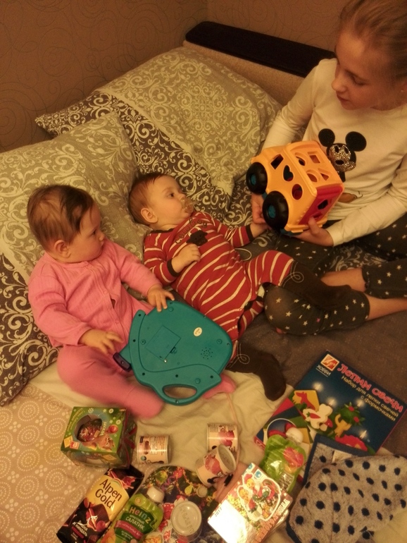 Ой, ну Слава Богу! Как я переживала! Сначала не успела вовремя отправить посылку, отправила на несколько дней позже и переживала что не успеет дойти. А потом приехала с почты и поняла, что потеряла чек... не могу его найти... Очень переживала что посылка не дойдет. Ну и конечно переживала понравится ли? Или уже на много старше и я уже и забыла что надо таким крохам. Ну надеюсь вам все понравилось и пригодится. С наступившим вас всех Новым Годом!!! Счастья и благополучия в новом году!