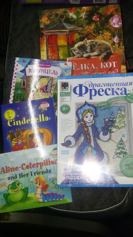 Набор для творчества - новогодняя фреска (ну теперь будет чем заняться в каникулы)))), книги для маленьких и книги на английском для старших (за что отдельное спасибо!)