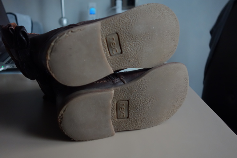 Подклад и стелька текстиль, верх - натуральная кожа, носы ободраны, но замазывала их коричным кремом или краской для обуви, состояние подошвы - на фото