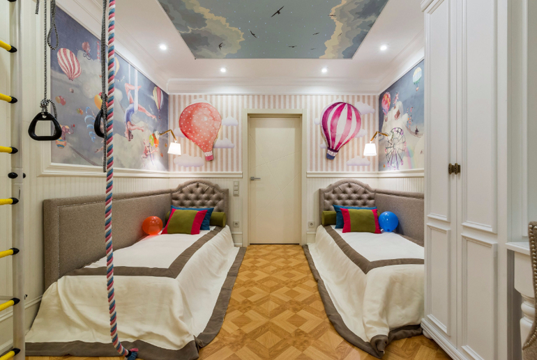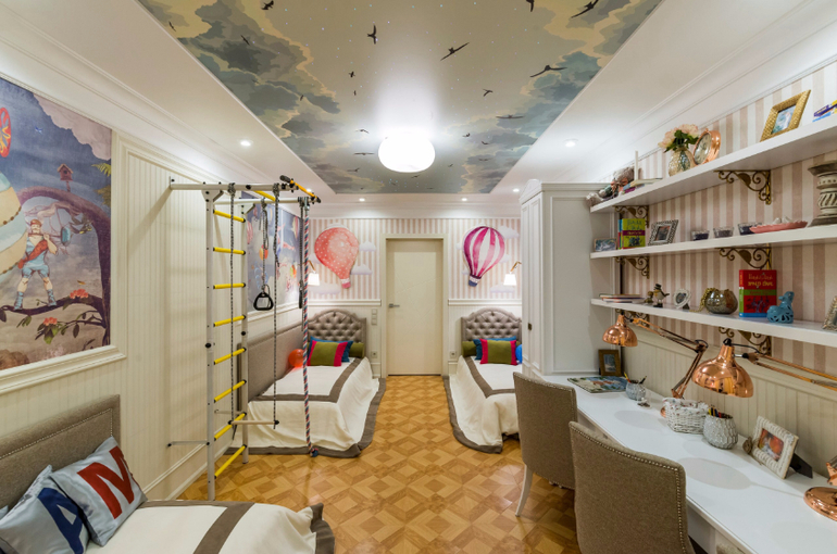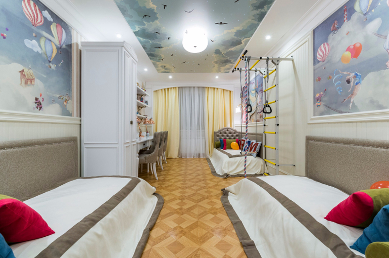 Для одежды один двухстворчатый шкаф?!?Для девочек?!?Простите,но книги-учебники куда?Игрушки опять-таки...И пол-покрытие-цветовая гамма-резкиё преход после нежного и воздушного потолка...Моё мнение-на троечку...Даёшь Гардеробную комнату!!!