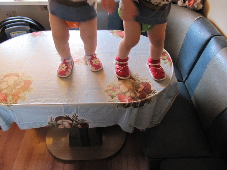 Радует то, что мои скалолазки умеют сами слазить, слезают правильно- ножками, не головой. Огорчает, что ориентация в пространстве ещё несовершенна, она только оттачивается. Плюс ко всему: двое - это вам не один. Когда одна экстремалка на табурете, второй срочно надо туда же. А два шилопопа на одной табуретке - это уже ощутимая нагрузка для моей психики.