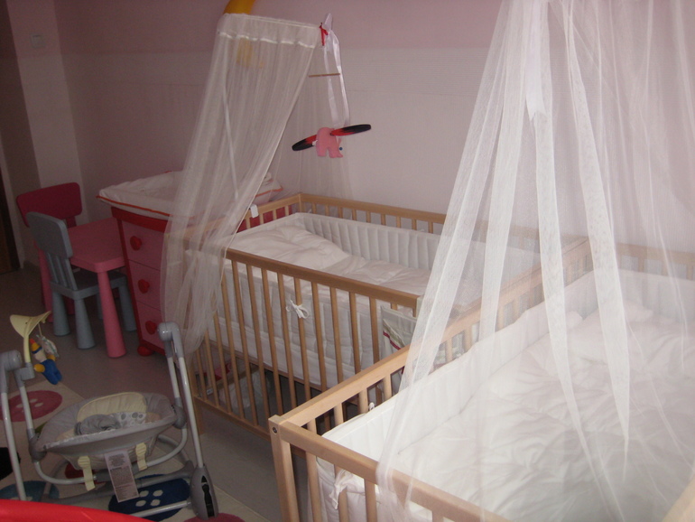 У нас комната не очень большая и кроватка параллельно нашей кровати стоит. Теперь если вторую поставить, то подскакивать прийдется чуть дальше..