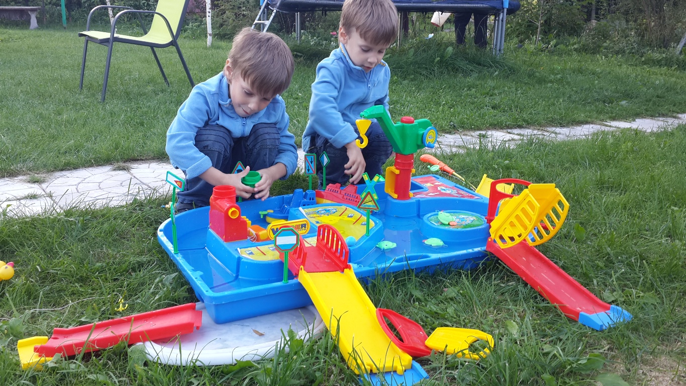 мои фанаты воды, поэтому заливали, там все мостики поднимаются, открываются "дамбы", т.е. кораблики, плавающие по каналам, переплывают, вот справа (на фото видно) - кран, на него с удовольствием грузы вешали, а на платформе (она вот там в дальнем правом углу) нагружали что-то... по "трапам" заезжали машины на "погрузку"... мои в каналы еще рыбок пускали и удочками (это уже отдельная игрушка) ловили рыбу... в общем, в прохладные дни ставили игрушку на крыльце, заливали горячую воду, и мои многофункционально использовали... удобство в том, что к этой игрушке можно докупить еще что-то (не смотрела пока, что именно) и разнообразить именно этот канал.