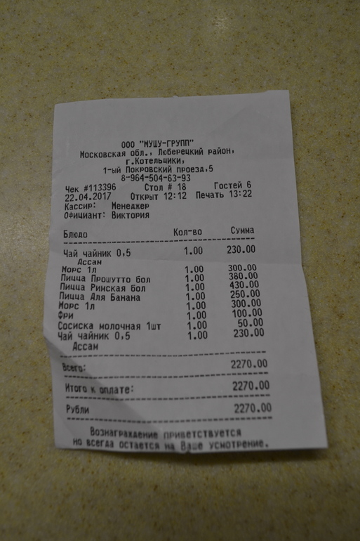 Основной наплыв народа был к 12-30 - 13-00. Мы в это время как раз пошли пообедать в кафе, расположенное на территории Кидбурга. Я читала в отзывах, что цены в этом кафе кусаются. Ну не знаю… Я бы не сказала, что они кусаются. На 8-х человек мы заказали 3 пиццы, 2 литра морса, 2 чайника чая по 500 мл, порцию сосисок с картошкой фри. Все это нам обошлось в 2270, т.е. 284 руб. с человека. Разве это дорого? На фудкорте мы поели бы за такие же деньги, а может и больше.