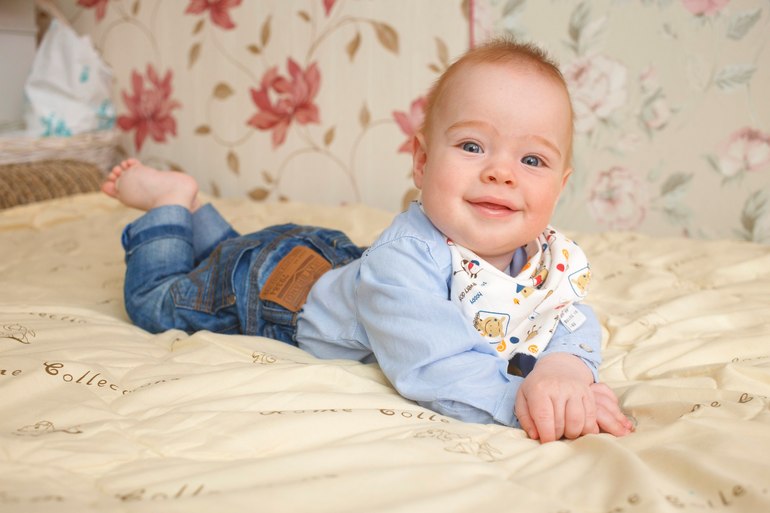 кушает все что в рот попадет))) А вот Санечка ленивый) только ползает по пластунски. Но быстро очень))