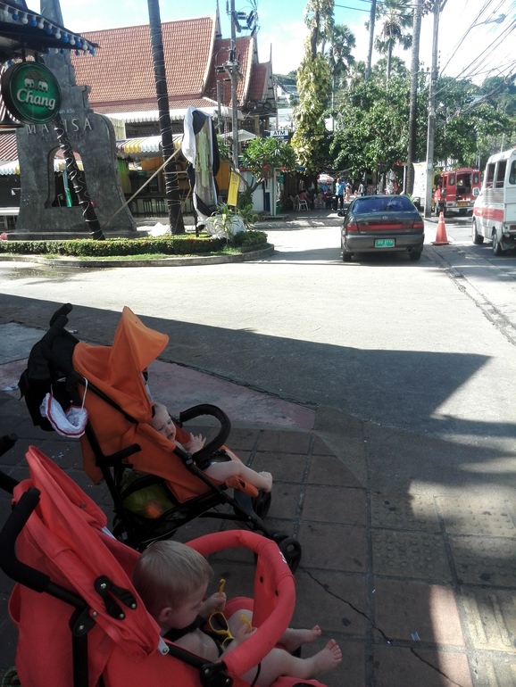 Стоит еще рассказать, что мы попали на Тайский НГ и соответственно на фестиваль Сонгкран. Было супер весело. Муж превратился в ребенка. Купили водный пистолет, все мокрые, радостные. Очень весело. Нас измазали местной благодатью( присыпка- тальк, разведенная водой). И вот под вечер, уже просушившись и идя вдоль улицы, дети спят в коляске и проезжающая мимо нас машина, обдала нас ледяной водой, в т.ч. и коляски. Мы минут 20 не могли успокоить детей. Молодые бестолковые тайцы, набирают в бак воду, туда кучу льда и вот так развлекаются. Но это скорее исключение, обычно поливали нас , но не коляски….