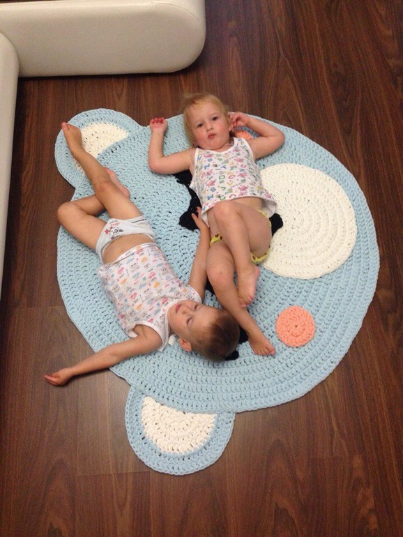 Коврик славный. Дети не делят его? И ещё вопрос: что за пряжа интересная, как ленточки?