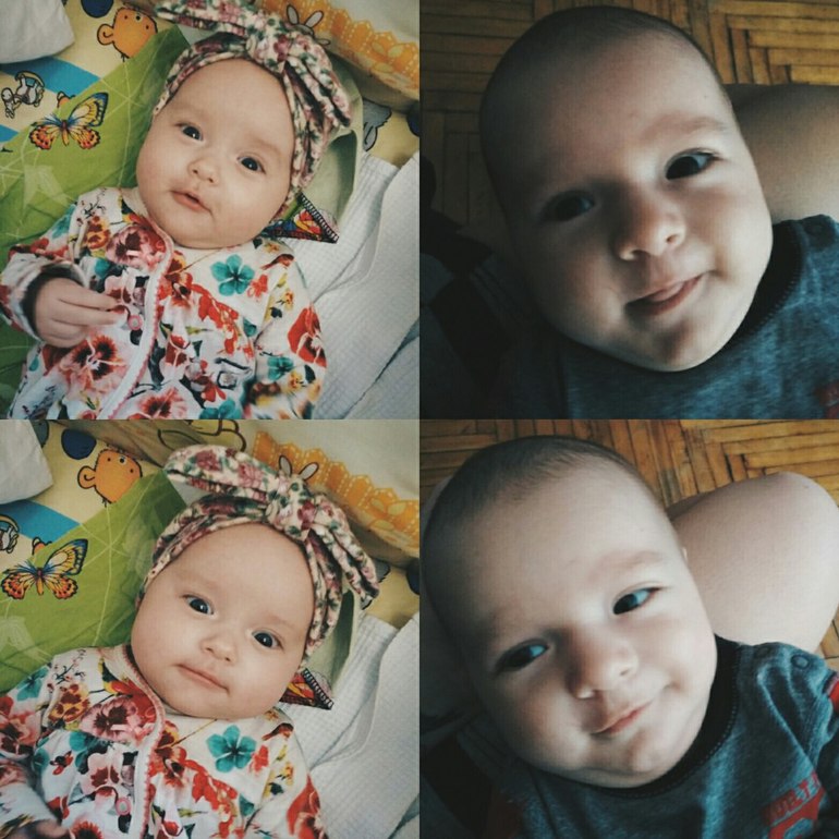 В общем, все началось с улыбок. Сын улыбается давно, улыбкой на улыбку отвечает примерно с месяца. Он бесспорно молодец. Но шло время, а дочь никак не хотела улыбаться мне. У меня уже челюсть болела от попыток ее "разулыбать". Без толку. Помню, вечером разговаривала с мамой по телефону, высказывая свое беспокойство, а наутро началось. И улыбка, и хватание себя за ляшки, и какие-то звуки. В общем, все, что она к этому возрасту должна была уметь, она научилась за одно утро. Как-будто тумблер в голове щелкнул, просто начала все делать.