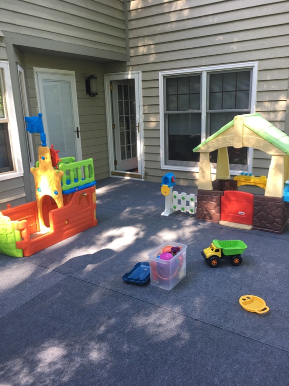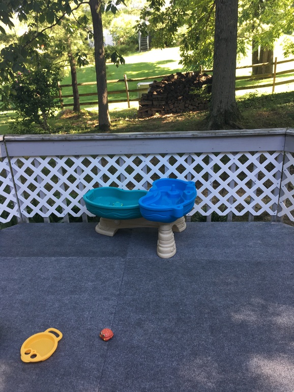 Домик , кораблик и для воды , иногда выносим надувной маленький бассейн , на полу покрытие .