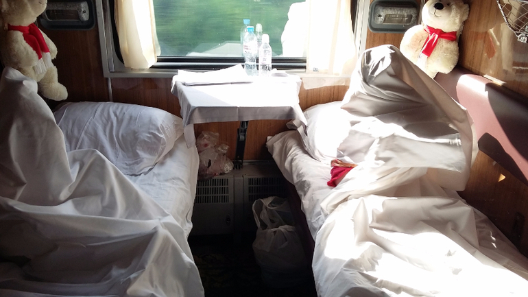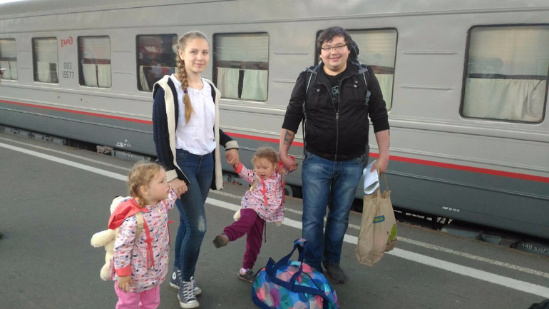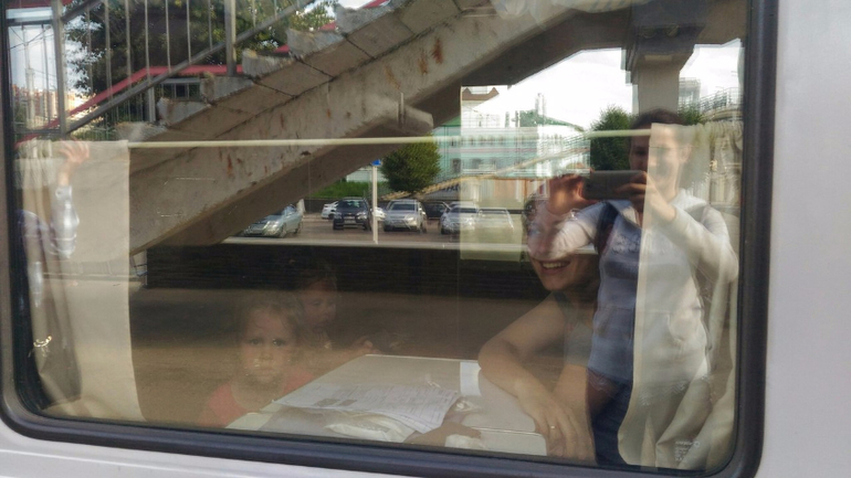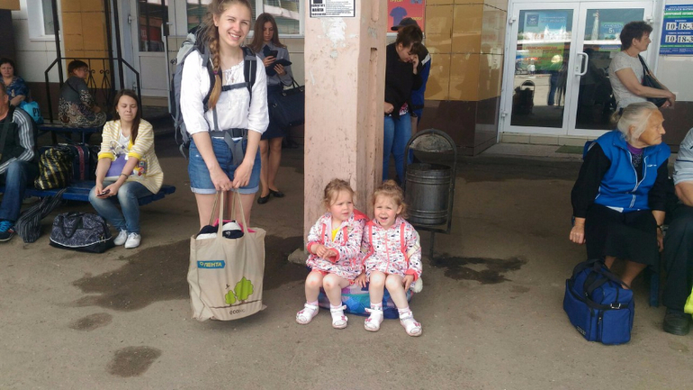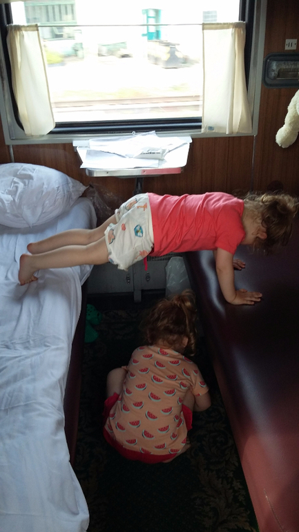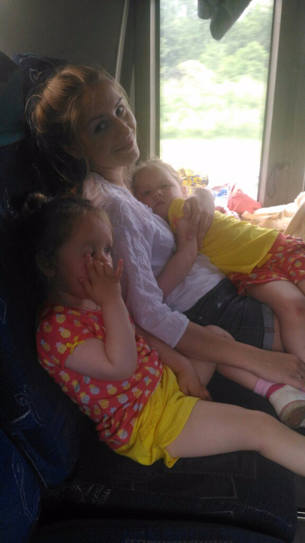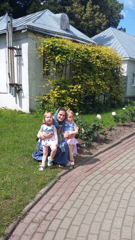 И пара слов про нашу поездку. На дачу соваться боюсь-- последние 2 лета наше пребывание там заканчивалось скандалом, поэтому довольно неожиданно отправились с дочками и нашей крёстной к её бабушке в Рославль. Это между Брянском и Смоленском. Первое большое путешествие, разумеется, вызвало много эмоций. Поезд понравился так, что ночью не могли заснуть. От духоты постоянно просыпались. Зато обратный путь прошёл уже легче. После поезда мы 2 часа ехали на автобусе, и оттуда под сильным ливнем на таксо. У бабушки Кати дети пристрастились к ягодам (правда, ходили с красными щеками из-за них постоянно), свежему укропу и зелёному луку. Катя начала, наконец, хоть как-то есть мясо. А Варя перекидывала свои куски сестре в тарелку.