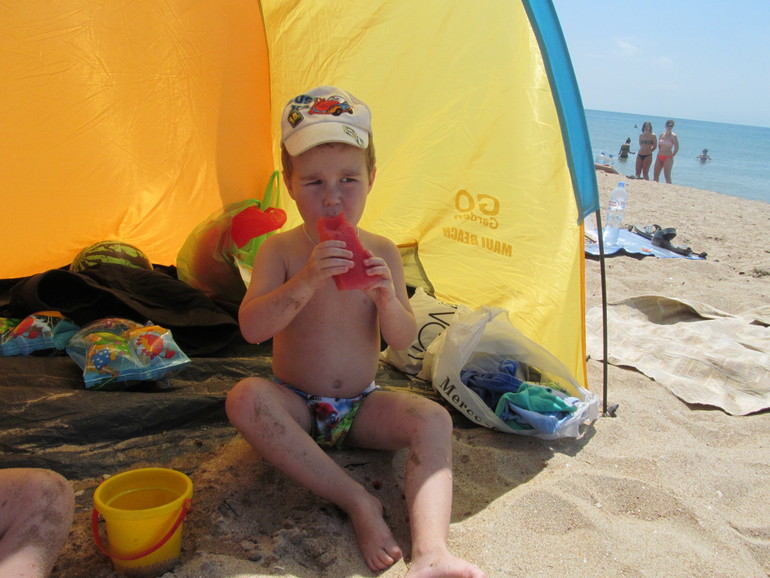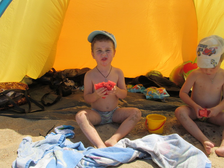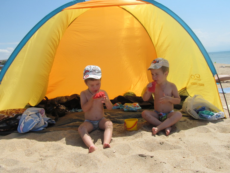 С палаткой хорошо, хоть от солнышка укрыться можно. Побыли мы до обеда. Оставаться дольше я не вижу смысла: и дети намаятся и взрослые. Кстати, в прошлом году мы плавали в кругах, а в этом - купили им нарукавники. Очень удобная штука!