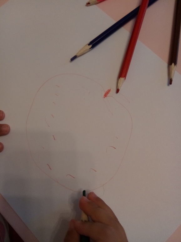 Рисунок Риты в 2,3г. Сказала, что это "яблоко". Потом наставила точек и сказала " комуника"! (Она же "клубника":))))