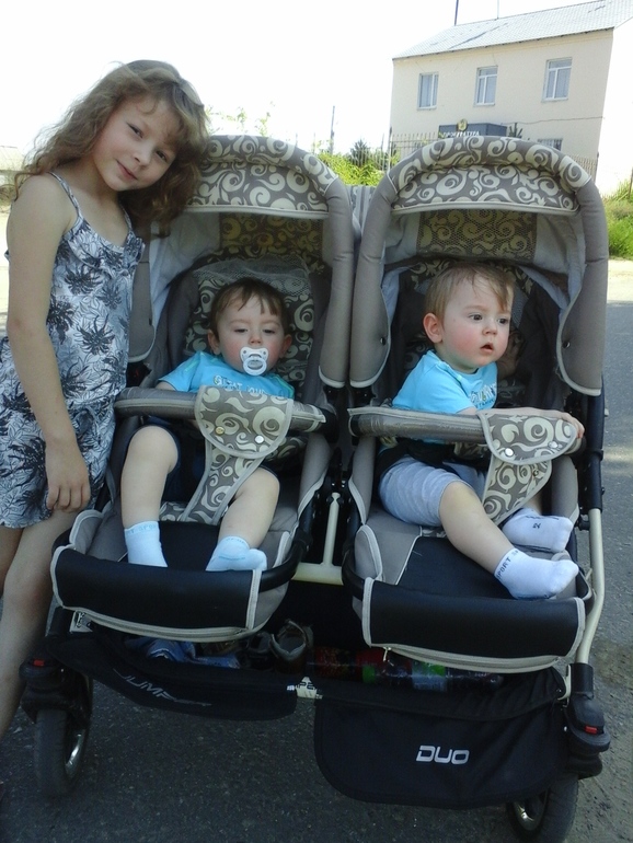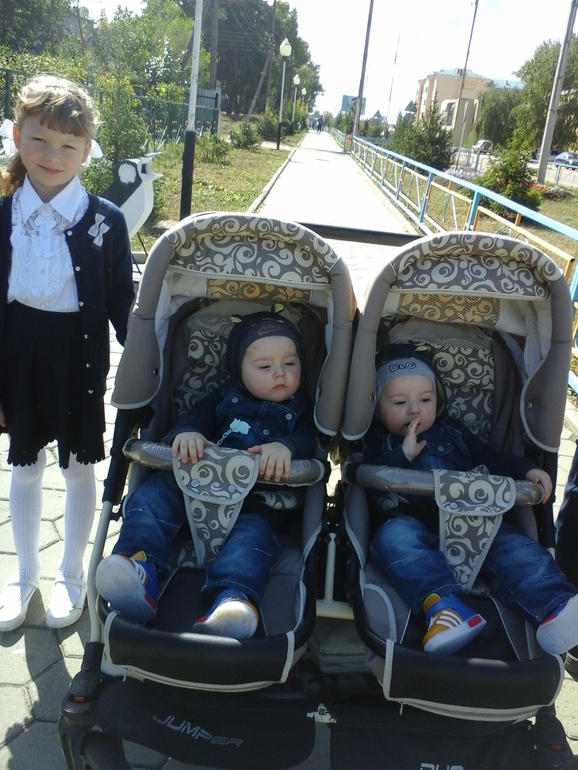 Мы живем в сельской местности. Хотя мальчишкам уже годик и мы гуляем практически каждый день, люди при видя двойной коляски улыбаются до сих пор. Мальчишки лучше ведут себя на прогулке. Доча помню не сидела в коляске, орала. На фото ближе к Софье Адам. Он у нас парень серьезный. Богдан очень жизнерадостный.