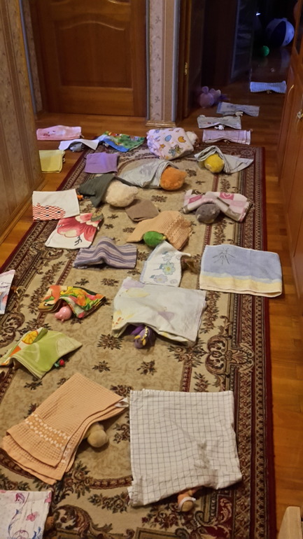 Или вот укладывали все игрушки и каждую накрывали "одеялом".