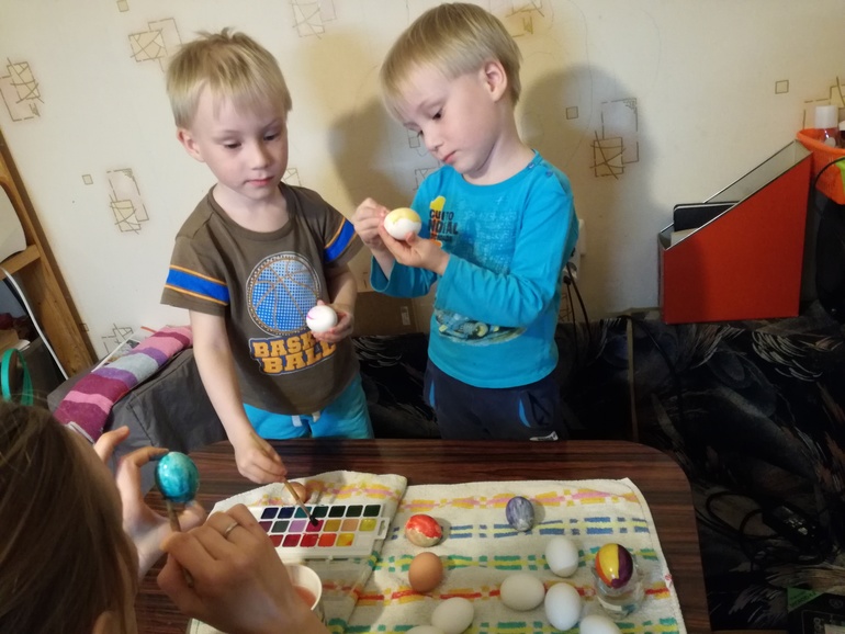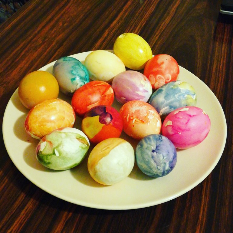 Мы супер-лениво наклеили пленки-цветочки и дети почти час развлекались поисками сокровищ и проверяли яйца на крепость. Есть никто не стал.