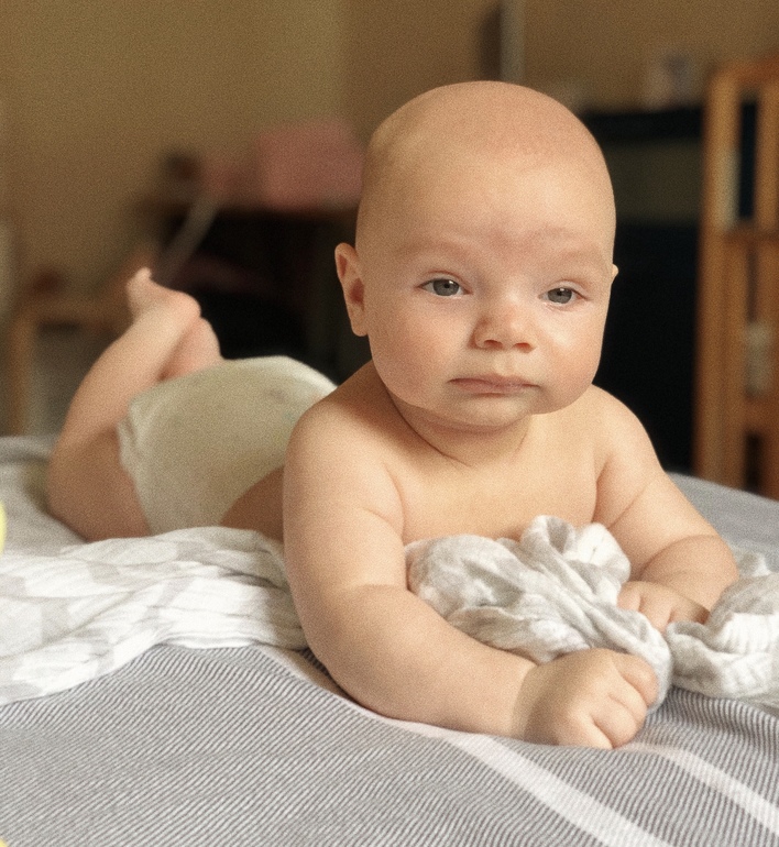 Куда положил там и лежит улыбается, очень любит хватать все руками, научился включать кнопки на игрушках и от этого я в шоке. Вроде ползти не особо пытается, точнее редко. Глаза у него меняют цвет и теперь не понятно какие. Думаю, ближе к карим. Вдумчивый и улыбчивый брюнет растёт.