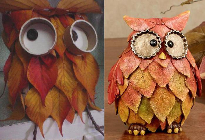 2. Эээээ...Это как бы сова. Бутылка из-под молока обклеена бумагой, сверху несколько рядов листьев всяко-разных и немного красоты - "художники ныне видят так"