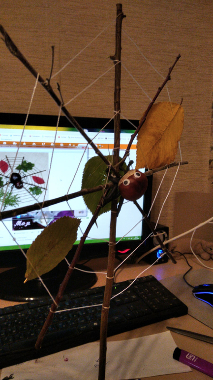 И когда воспитатели нас обрадовали осенними поделками, у меня уже лежали готовые "материалы". Выбрали идеи. Поехали. Особо сложные места делала сама, остальное - показывала и поправляла. Задумка была прекрасна! (идеи из интернета). Потом мы ЭТО воплотили.