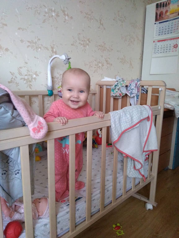 Сейчас намерили рост и вес у Алины ровно 9 кг и 69 см, Полина на 200 грамм полегче, но длиннее - 71 см. Девочки мои по сравнению с мальчиками вообще никуда не торопятся. Полина в 8 месяцев сама начала садиться и почти сразу поползла. В 9 месяцев встала в кровати, сейчас встает везде, где может, но пока неуверенно, долго не стоит, больше ползает.