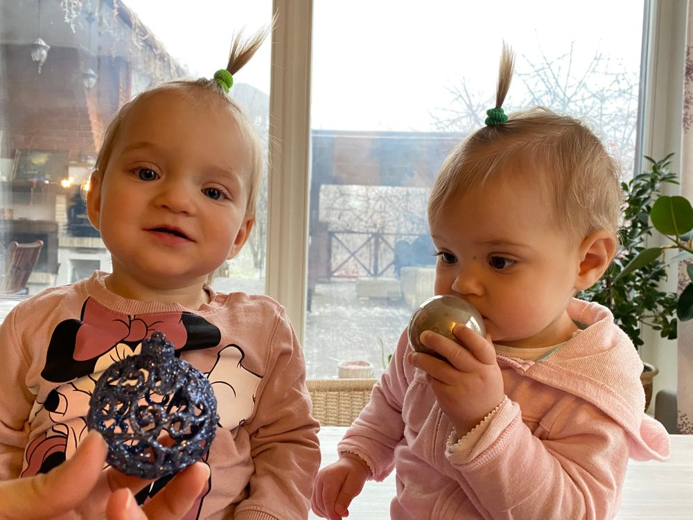 Девченки вот вот подойдут, лепечут, пытаются опрокинуть елку и таскают собаку за хвост.