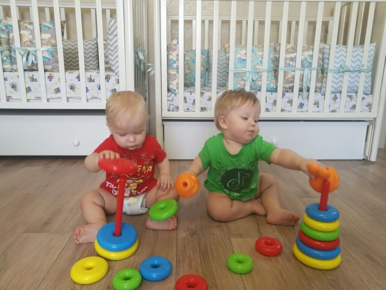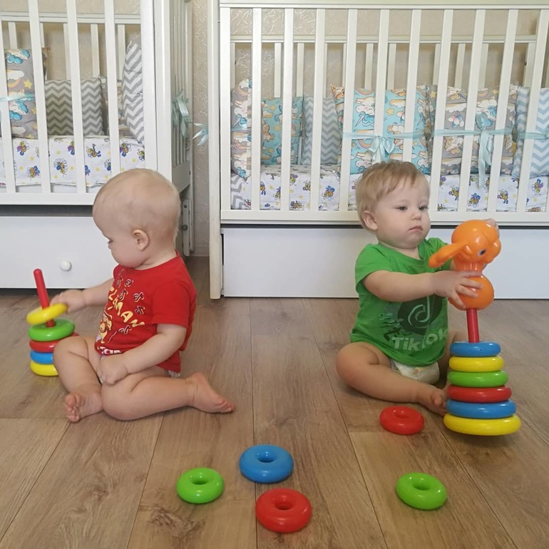 Двойняшки до 1 годаВремя просто летит )) Настало время когда с детками безумно интересно, но и сложно в то же время... Стали бегать за нами, не спрячешься)) в туалет со мной, в ванную тоже, покушать сесть- они тут как тут, папа приходит, захватывают его с двух сторон. Очень любят внимание). Но если заигрались, то могут и час играть вместе, ну как играть🙈 отбирать друг у друга игрушки-хныкать, трепать кошку, вытаскивать коробки с обувью из шкафа, если кто-то забыл его замкнуть) Начали собирать - разбирать пирамидку, я помогаю конечно, не ожидала что им понравится, кубики тоже складывать в башню из двух штук)) Андрей более усидчивый, любит посидеть покапаться, Вова любит больше всё сломать и раскидать и психует если что-то не получается🙈 Стоят оба без опоры, Вова пытается делать шаги, вдоль опоры ходят очень шустро. Болтают по-своему ба-ма-айда-де)) Ну и зубы никто не отменял, лезут то у одного то у другого, от этого ночью спим с переменным успехом.... У Андрея 3, четвертый на подходе, переносит легче. У Вовы 4, пятый на подходе, очень тяжело, температура до 39 бывало поднималась. В общем очень весело, что я к вечеру с ног валюсь и глаз дергается😰 как и у всех мам двоен)