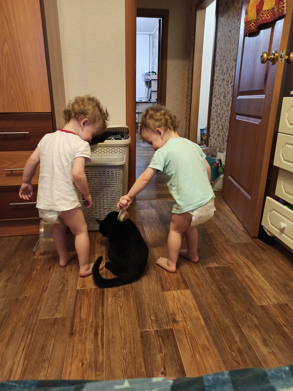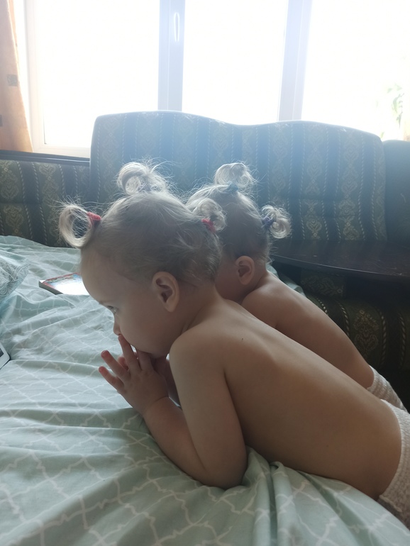 Взрослеют с каждым днём, теперь к 2м годам ближе, чем к 1). Мне стало немного легче после полутора , хотя вроде ничего не изменилось. Возможно я просто привыкла 🤷. О развитии на память: Рост 88-89, вес примерно 12.5 держится - не растёт, зато растёт нога, пришлось покупать новые зимние сапожки 27 размера)) 13 зубов у каждой. Бегают, поднимаются по небольшим ступенькам без опоры, но большим - держась за поручень или обе руки. Научились залазить и спускаться по вертикальной лесенке. Прыгать пока не получается. У девочек сейчас новое увлечение на смену куклам и мишкам пришли машины и трактора, теперь целыми днями читаем про них книжки или рассматриваем на улице. Любят клеить наклейки, особенно себе на ноги, но и в кружочки попадают, если хотят. Любят рисовать карандашами . Больше всего любят смотреть книги. Знают простые фигуры круг-квадрат-сердечко, любимая форма -звезда. Собирают сортёры, складывают картинки из двух половинок, вкладыши с фоном. Строят башни из конструктора мегаблок, собирают поезд Лего и животных из Лего (не по образцу, а по своему) садят на него кататься Цвета пока никак, пирамидка не порядку. Говорят пока мало и это лепетная речь, слова из первого слога ( ба-балет,бе-бегемот) или из повторяющихся мама, Биби, Кики (кошка) много звукоподражаний животным. Думаю насчёт занятий с логопедом-дефектологом. У Арианы немного получше, есть глаголы беги, пойдём и иногда получаются фразы типа Кики ням ням, мама дай. Марина умеет сама есть ложкой, намного лучше сестры ест взрослую еду. Есть до сих пор не любят обе, даже печенье не хотят. Интересуются сверстниками, играют уже вместе с племянником (2.5), а не просто наблюдают - бегают в догонялки, в ку-ку, приносят ему игрушки. Ариана очень любит кататься с горки, иногда ездит на ледянке по дому)) гулять стараемся по два раза в день, хоть это и сложно мне даётся, пока оденешь-разденешь всех с ума можно сойти, гуляем без коляски и санок, так что только по соседним дворам. Сфотографировать нормально просто нереально)) Самые любимые и замечательные мои девочки ❤️♥️