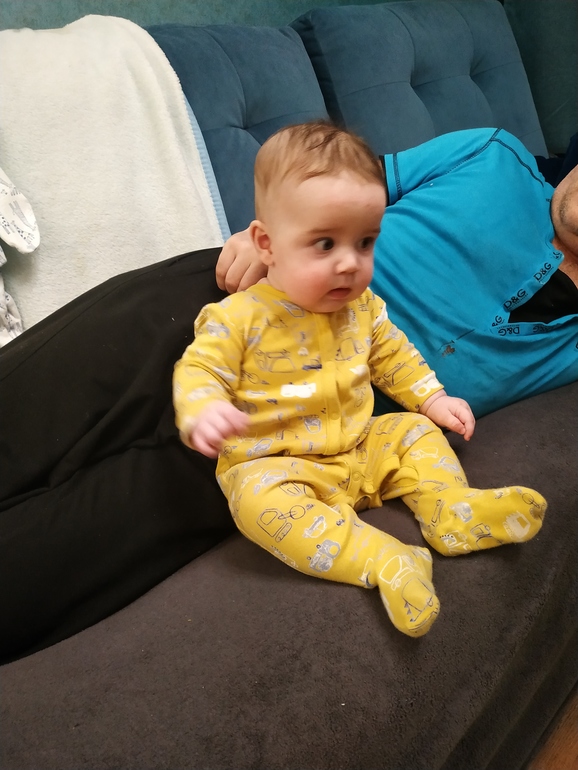 У Вани пока зубов нет, но зато он начинает потихоньку присаживаться стоя на коленях и уже давно ползает назад. Вперёд пока только прыжками :)