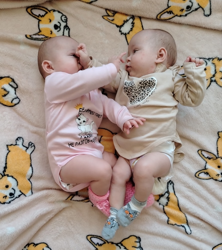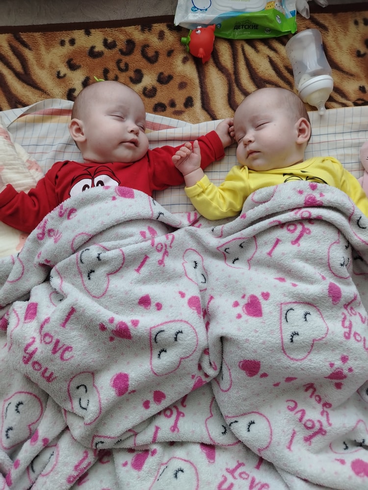 Мы родились 13 мая, 2 прекрасные девочки Зоя и Ева, родились на 34 неделе, весом 1950 и 2380,такие маленькие и скрюченые, синюшненькие. Теперь же это активные карапузы, которые уже многое умеют. Наши умелки: переворот с живота на спину, держим и хватаем погремушки, иногда забирают друг у друга, хорошая опора на руки, замечательно приподымаем туловище, удерживая головку, Зоя уже переворачивается со спины, Евка пока её догоняет,постоянно куда-то бегут, показывают голосом свое возмущение, лопочут друг другу, хохочут мне и друг другу.
