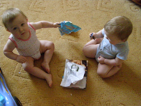 Умельческое- ходим!!!(слава Богу, дождалась). Крис перестала ползать, даже если упадет, поднимается и идет дальше. Таня пока неудачные попытки идти меняет на ползание. Пьют из трубочки, пытаюсь всунуть чашку- все на пол. Игры все теже- сортер, пирамида, машина.