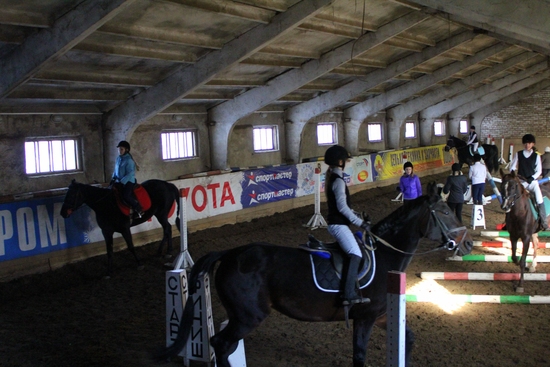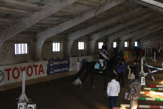 Соревнования проходили в крытом манеже, но теплей конечно от этого не стало, просто не было ветра, а погодка была в те выходные морозная, -15 и без снега))))))))) замерзли конечно жутко, но больше переживала за девчонок (в основном девочки занимаются, мальчик всего один у них), они то совсем раздетые, только в тоненьких кофточках, бриджах специальных. Мы приехали немного раньше и наблюдали за сборами лошадей и всадников