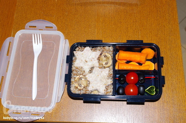 Сегодня оформление-приготовление заняло 20 минут... Звездочки - котлета + гречка с грибами, на шпажках помидорки-черри с маслинами, морковка (не придумала, как ее лучше оформить). Сверху закрываю пищевой пленкой, кладу вилку и крышкой. Ищу рецепты непортящихся белковых блюд.