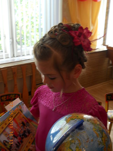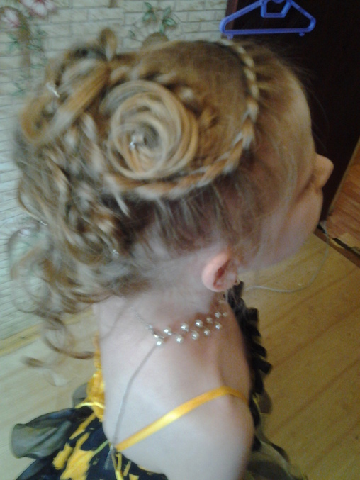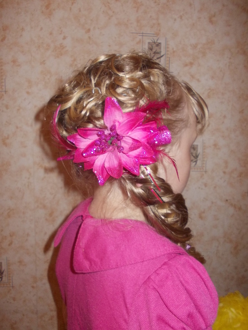 Вот такая была прическа, так как было ветренно и обещали дождь вроде. К сожалению, родители девочки не купили аксессуар, подошедший к платью. Волосы очень длинные.