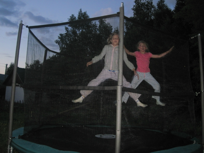 Нам сказали по инструкции батут выдерживает до 120 кг. Лена + Света + Аф ровно половина от этого веса. 60 кг)
