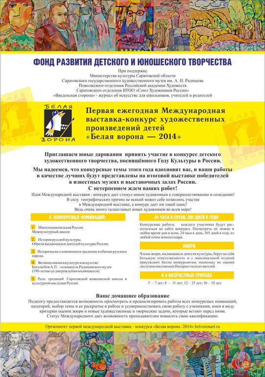 Увлечения, хоббиПриглашаем юные дарования принять участие в Первой ежегодной Международной выставке-конкурсе художественных произведений детей «Белая Ворона - 2014», посвящённого Году Культуры в России.