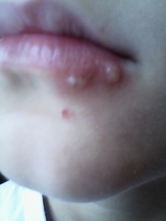 Герпес. Если ациком или зовираксом нельзя (надо смотреть инструкцию, со сколько лет можно применять), то хоть зелёной помазать можно.