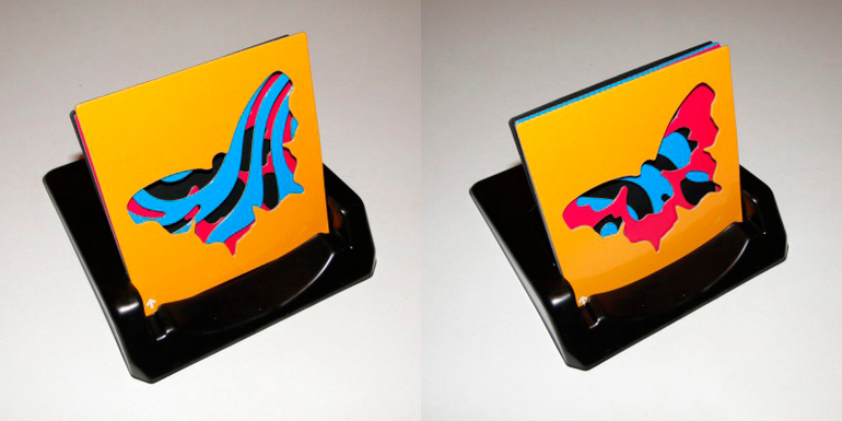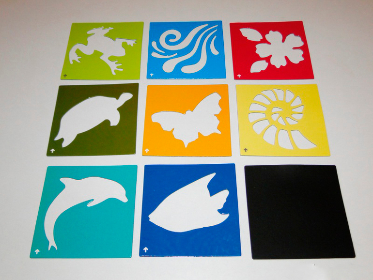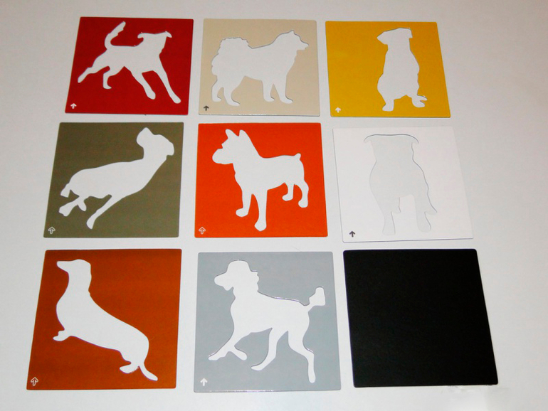 Итак, перед вами 8 трафаретов с вырезанными контурами и 1 карточка - черного цвета. Вам нужно сложить эти трафареты в таком порядке, чтоб повторить картинку из книжки с заданиями. Трафареты двусторонние, их можно крутить-вертеть в разных направлениях, пока не подберете нужное положение. Чтоб облегчить задачу укладывания картонок, к набору прилагается пластмассовая подставка.