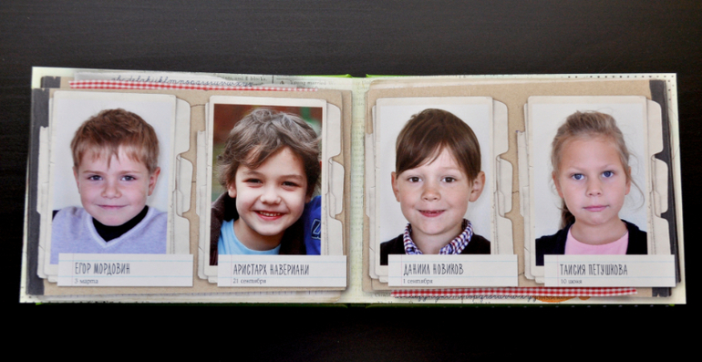 На первом развороте фото с 1 сентября, дальше крупные портреты одноклассников с именами и датами рождения, ну а в конце фото из жизни класса:) Частично фотографировала сама, частично родители.
