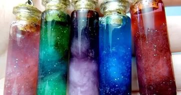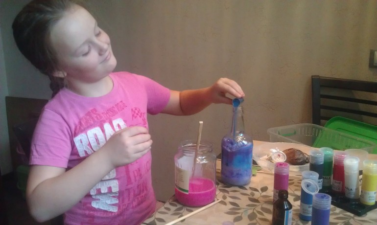 в бутылку клали вату, потом глицерин, блестки. Разводили гуашь в воде, заливали вату. И так повторили 4 раз с разными цветами.