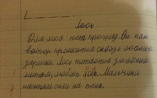 Эх, жаль нет ничего под рукой. Моя практически не рисует. Нет, рисовать она любит, но уровень... Думаю, младшая скоро переплюнет. Хотя на 4 года младше. Почерк соответствующий. Читать можно, уже спасибо.