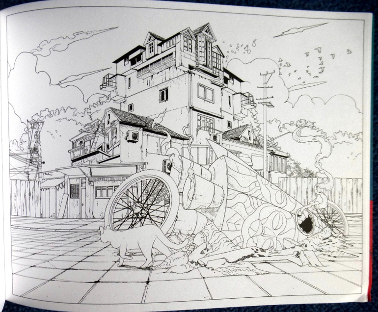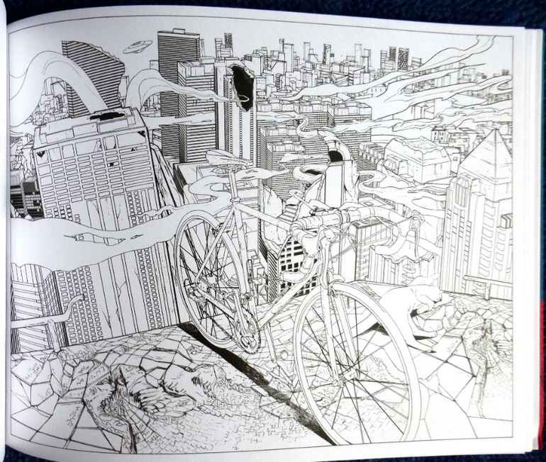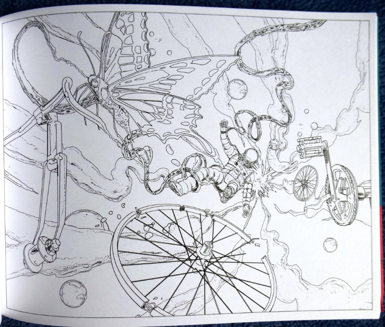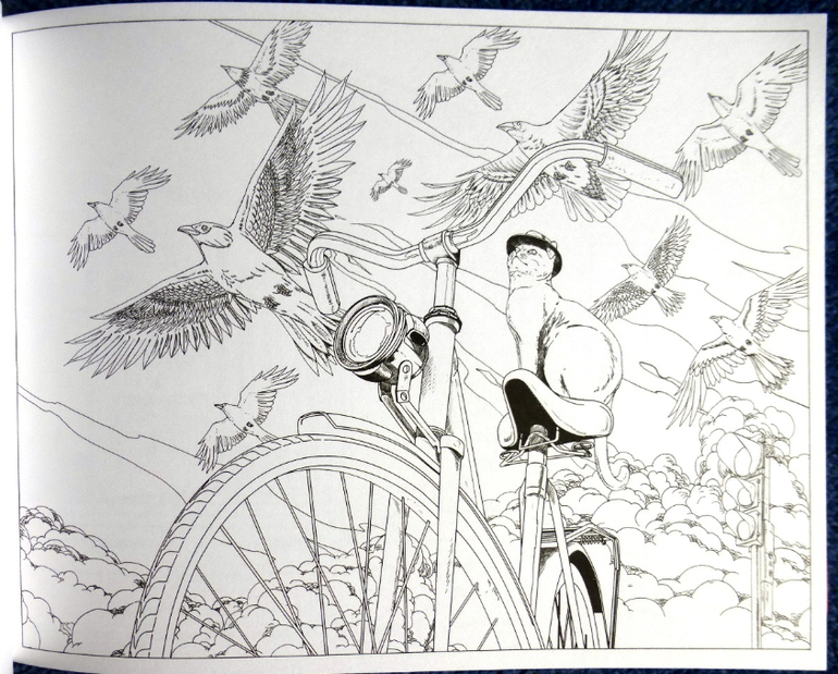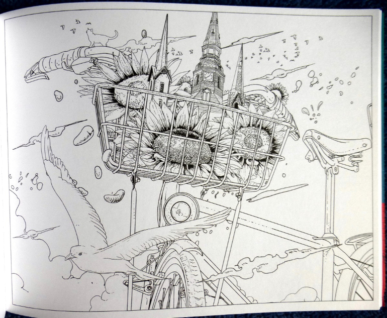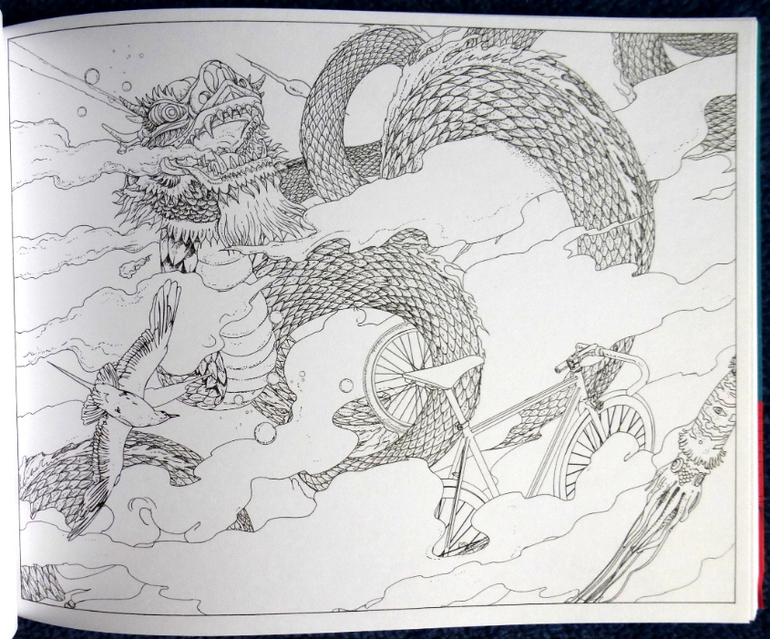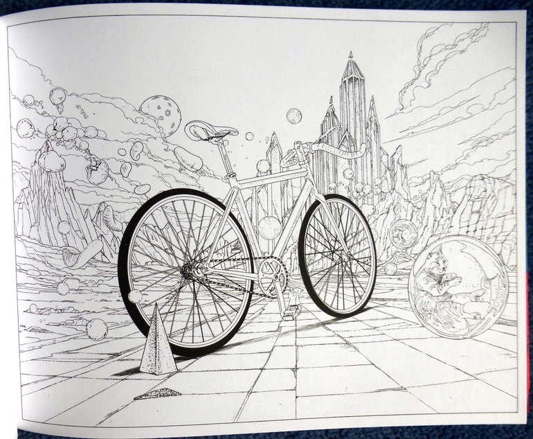 «Вокруг света на велосипеде» - необычная раскраска, раскраска-фантазия. Это история о путешествие вокруг света велосипеда и кота, а на пути их ждет немало сюрпризов, встретятся им и летающие киты, и огромный кролик, и астронавт с сачком, и медузы, и дракон. Очень необычные иллюстрации и креативные. Фантазия автора мог бы позавидовать любой писатель-фантаст! Раскраска вдохновляет.