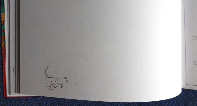 Еще одна фишка раскраски, это то, что на каждой странице можно найти кота. И, кроме того, на каждой пустой страничке есть тоже маленький рисунок в нижнем левом углу, если пролистать быстро раскраску, то вас ждет небольшой сюрприз)
