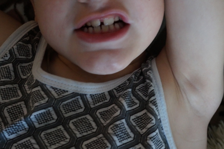проверьте уздечку вержней губы-если она большая, то нужно подрезать. ! у меня у дочки 1г5м она есть и нам сказали как только постоянные полезут подрезать обязательно.