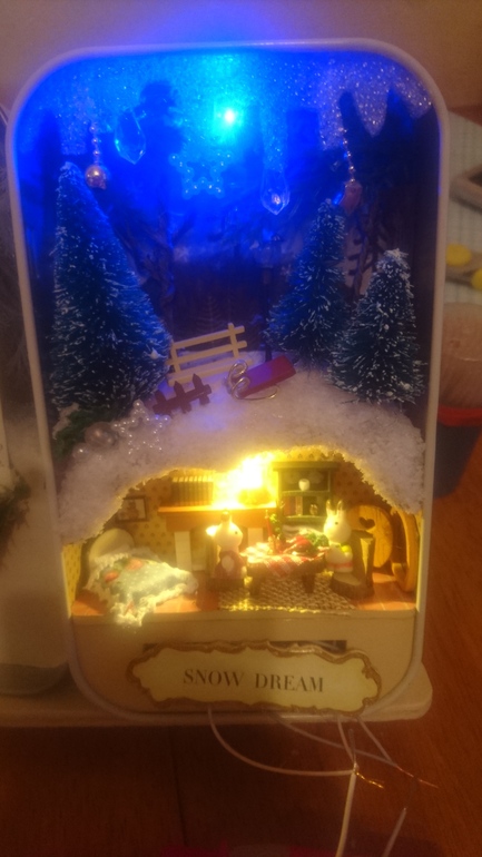 Вот такую красоту мы собрали и склеили из наборов "Лесная рапсодия" и "Зимняя сказка". Это домики для зайчиков, зайчики тоже идут в комплекте. Собирали всё полностью сами, склеивали крошечную мебель (столики, кроватки, шкафчики, угощение), клеили обои. Проводили свет в домики. Да, в домиках можно включать свет, над небом тоже проходят лампочки и они мигают разными цветами.