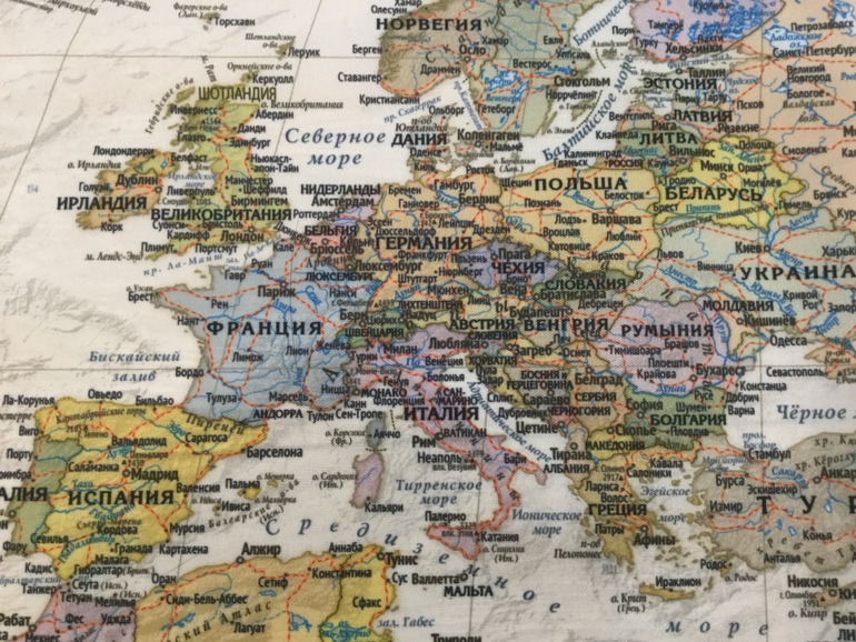 Нам стен не хватает, поэтому приобрела карту-скатерть. На фото она лежит на полу, поиграли-убрали, в ширину 220см. На ощупь нечто среднее между тканью и клеенкой.