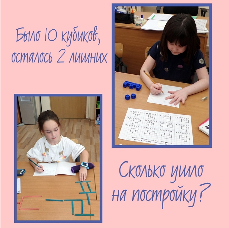 3️⃣ Можно тренироваться с кубиками или счётными палочками: например, выдаём ребёнку десять кубиков и схему, по которой он строит фигуру. Остаётся два лишних кубика, и звучит вопрос: "а надо ли считать, сколько кубиков сложилось в фигуру, или это можно узнать по-другому?"