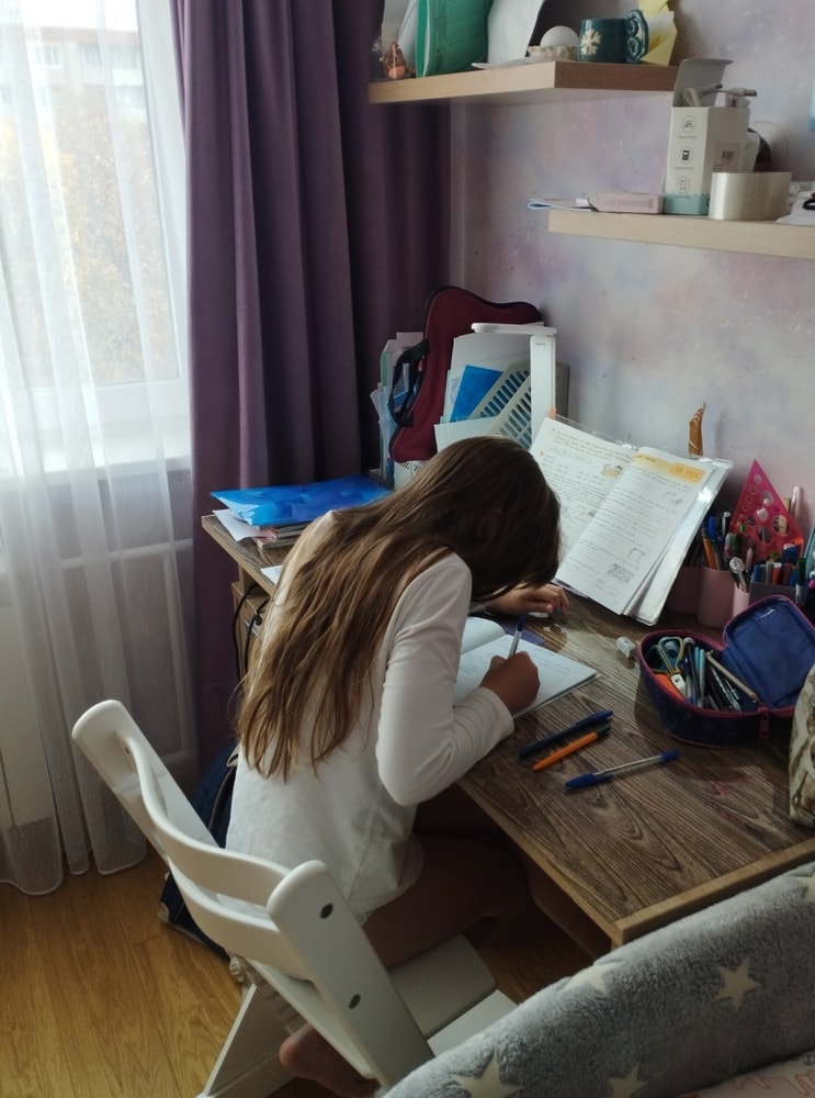 Ноги - это проблема с самого начала. Еще проблема в том, что сама сидя на этом стуле, она продвинуться не может к столу, в 1-2 классе я придвигала, а в третьем она уже сама за уроки садилась...