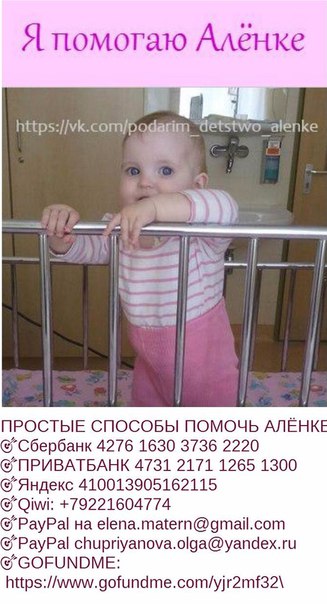 Действовать нужно немедленно...и без Вашей помощи Нам и теперь не обойтись! Обследование, подготовка к операции ,поиск донора и пересадка стоят неподъёмных денег для маленькой семьи, состоящей из мамы,брата Данила(12 лет) и самой малышки Алёнки. Обращаемся к Вам с просьбой о помощи! У Аленушки наконец- то появился реальный шанс - излечиться и вернуться к любопытной, полной ярких впечатлений детской жизни. Мы так долго этого ждали!..И уверены, что любовь к ближнему творит чудеса! Каждая Ваша копеечка- это маленький шаг к Доброму, Большому делу. Давайте вместе маленькими,но дружными, уверенными шагами приведем эту малышку к выздоровлению! Благодарим Вас, Друзья, за отзывчивость и гуманность, за переживания и сплоченность!